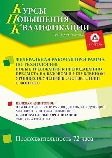 Федеральная рабочая программа по технологии: новые требования к преподаванию предмета на базовом и углубленном уровнях обучения в соответствии с ФОП ООО (72 ч.)