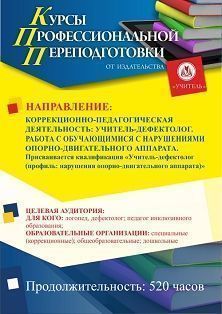 Коррекционно-педагогическая деятельность: учитель-дефектолог. Работа с обучающимися с нарушениями опорно-двигательного аппарата. Присваивается квалификация Учитель-дефектолог (профиль: нарушения опорно-двигательного аппарата) (520 ч.)