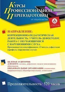 Коррекционно-педагогическая деятельность: учитель-дефектолог. Работа с обучающимися с нарушениями слуха. Присваивается квалификация Учитель-дефектолог (профиль: нарушения слуха) (520 ч.)