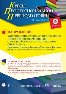 Коррекционно-развивающее обучение и воспитание обучающихся с расстройствами аутистического спектра (РАС). Присваивается квалификация Учитель-дефектолог (профиль: расстройство аутистического спектра) (520 ч.)