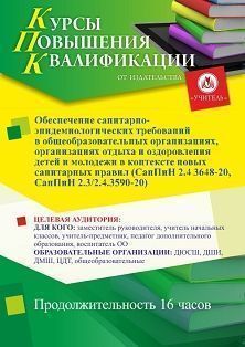 Обеспечение санитарно-эпидемиологических требований в общеобразовательных организациях, организациях отдыха и оздоровления детей и молодежи в контексте новых санитарных правил (СанПиН 2.4 3648-20, СанПиН 2.3/2.4.3590-20) (16 ч.)