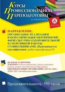 Организация, реализация и популяризация мероприятий физкультурно-оздоровительной и спортивной работы со школьниками. Присваивается квалификация (выбор квалификации*) (550 ч.)
