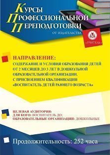 Содержание и условия образования детей от 2 месяцев до 3 лет в дошкольной образовательной организации. Присваивается квалификация Воспитатель детей раннего возраста (252 ч.)