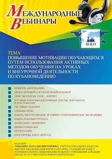 Международный вебинар Повышение мотивации обучающихся путем использования активных методов обучения на уроках и внеурочной деятельности по кубановедению