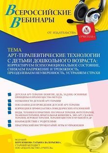 Вебинар Арт-терапевтические технологии с детьми дошкольного возраста: корректируем психоэмоциональное состояние, снижаем напряжение и тревожность, преодолеваем неуверенность, устраняем страхи