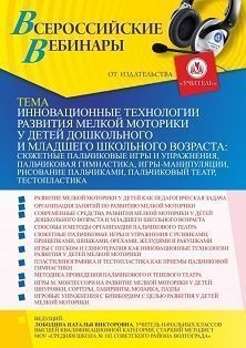 Вебинар Инновационные технологии развития мелкой моторики у детей дошкольного и младшего школьного возраста: сюжетные пальчиковые игры и упражнения, пальчиковая гимнастика, игры-манипуляции, рисование пальчиками, пальчиковый театр, тестопластика