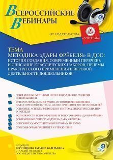 Вебинар Методика Дары Фрёбеля в ДОО: история создания, современный перечень и описание классических наборов, приемы практического применения в игровой деятельности дошкольников