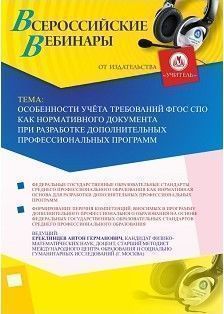 Вебинар "Особенности учёта требований ФГОС СПО как нормативного документа при разработке дополнительных профессиональных программ"