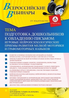 Вебинар Подготовка дошкольников к овладению письмом: игровые нейропсихологические приемы развития мелкой моторики и графомоторных навыков