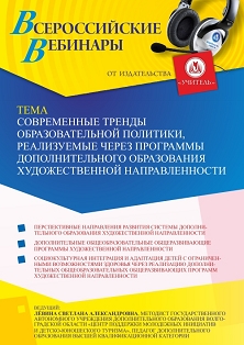 Вебинар Современные тренды образовательной политики, реализуемые через программы дополнительного образования художественной направленности