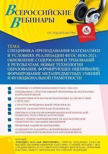 Вебинар Специфика преподавания математики в условиях реализации ФГОС НОО-2021: обновление содержания и требований к результатам, новые технологии образования, формирующее оценивание, формирование метапредметных умений и функциональной грамотности