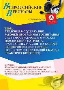 Вебинар Введение в содержание рабочей программы воспитания системообразующего модуля “Воспитание патриота, гражданина России” на основе принятия идеи служения Отечеству со школьной скамьи (практический опыт)